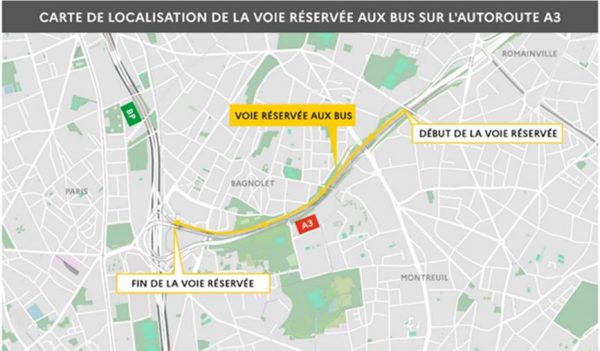 Depuis le vendredi 14 juin 2025, une nouvelle voie réservée aux bus a été mise en service sur l’autoroute A3, dans le sens Province-Paris, sur les communes de Romainville, Montreuil et Bagnolet.